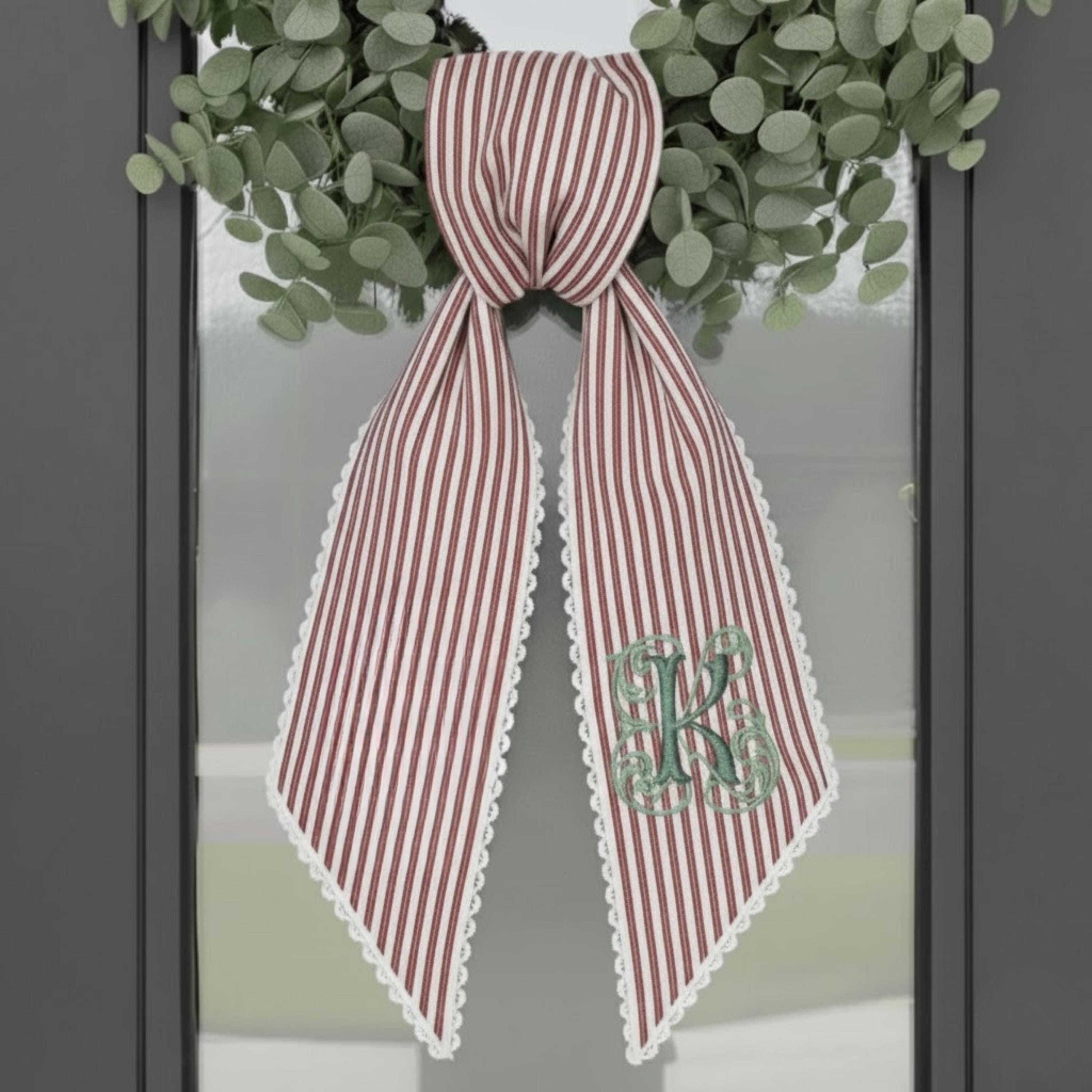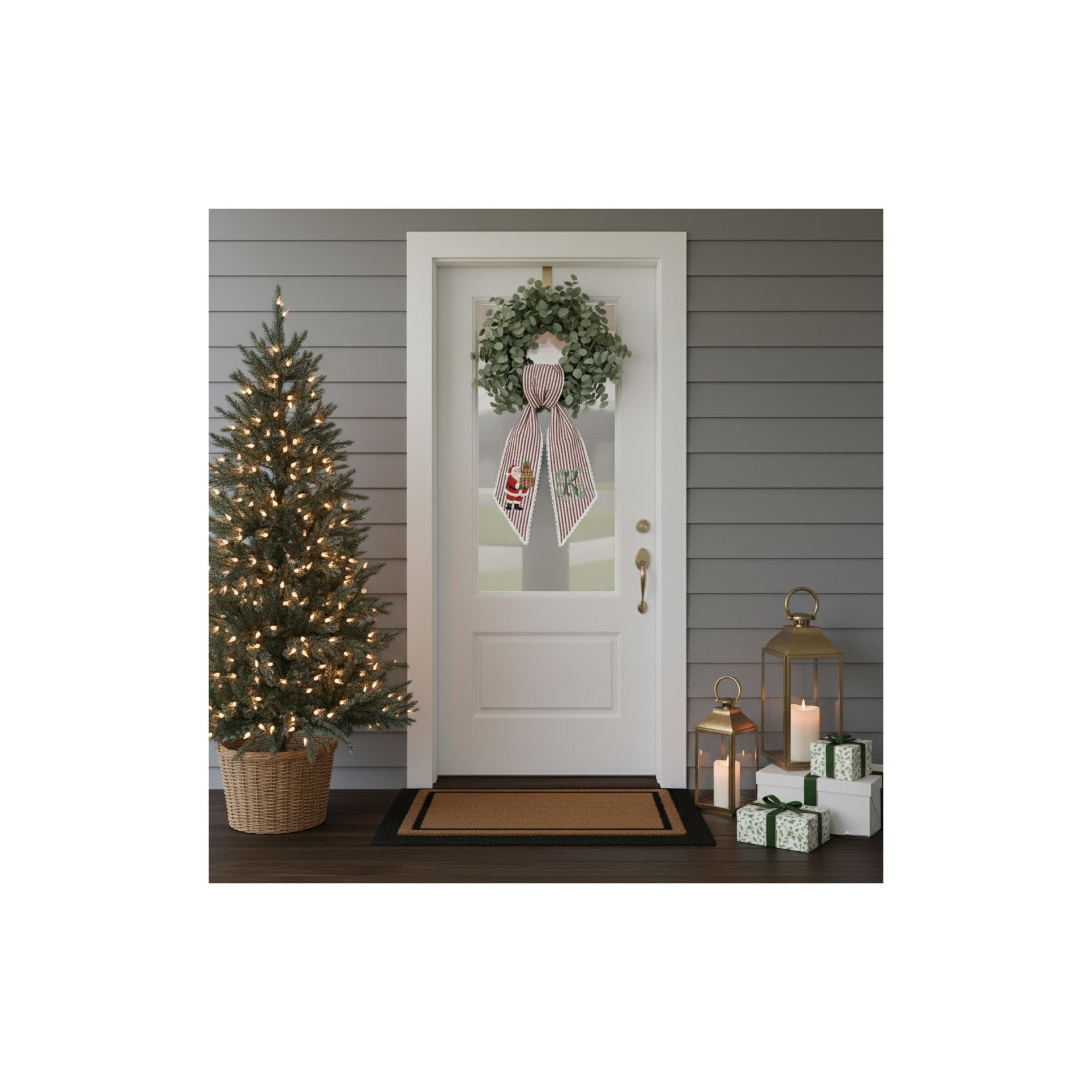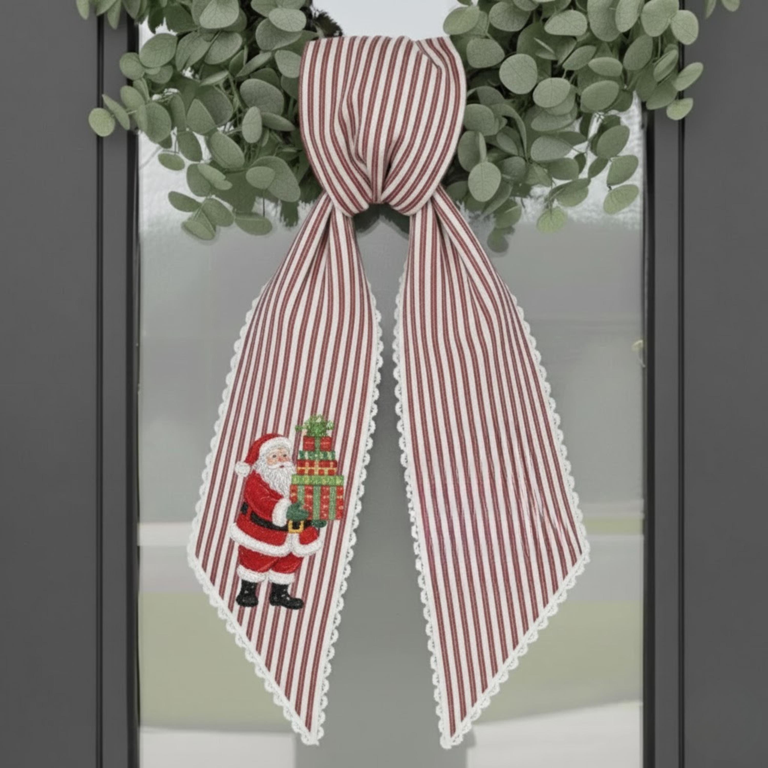 Bring timeless Christmas charm to your front door with this beautifully embroidered Santa Claus wreath sash! Crafted from a festive red-and-white ticking stripe fabric, this sash combines classic holiday style with personalized details for a warm, welcoming touch to your home.